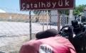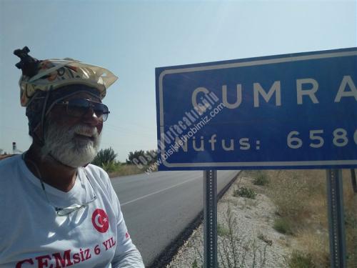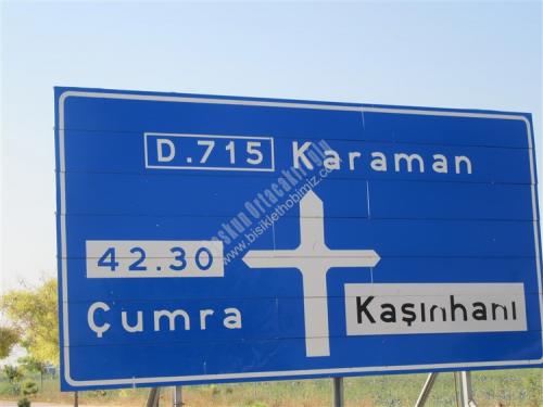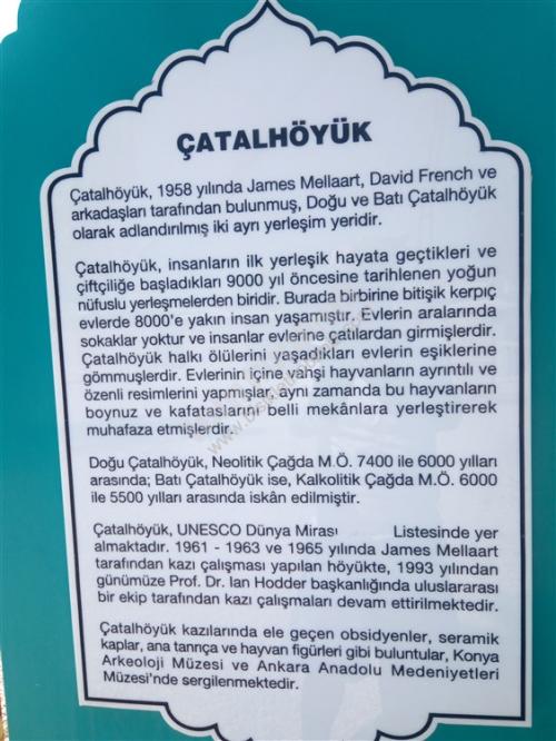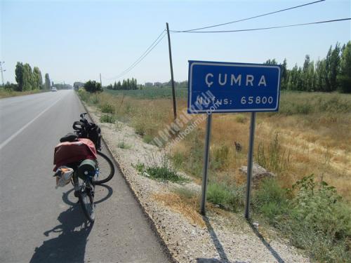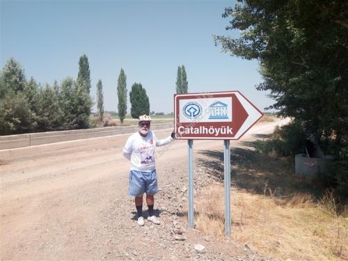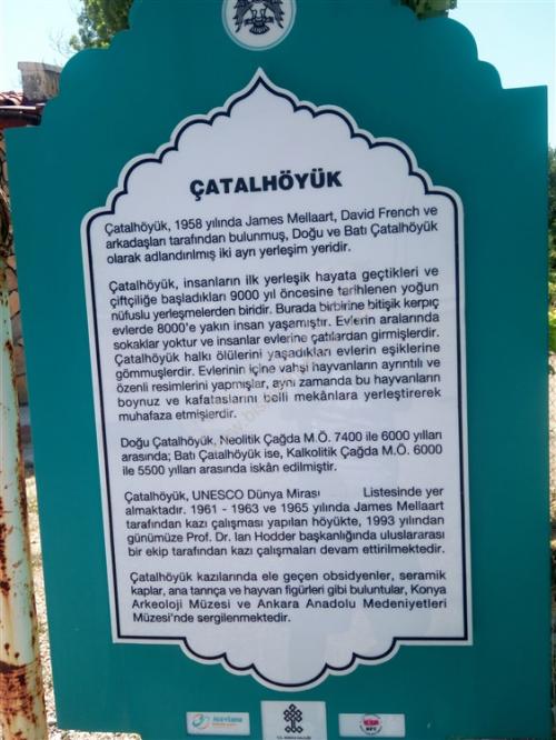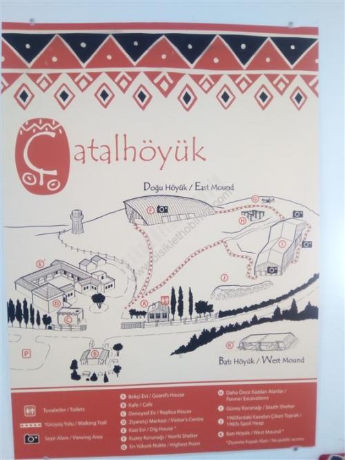 35. gün hedefimiz Çumra aklımda Çatalhöyük Bünyamin müdürün söylediği yer, geçmişte Antalya müzesini gezerken Çatalhöyük seramikten çalışması var diye hatırlıyorum, Konya'dan içeri Çumra'ya kadar bölünmüş yol cetvel gibi düz, Çumra ilçesinin ilginç bir hikayesi var, sorduğum kişiler içeri mi, kaza mı demişti, baştan anlamadım, yol kenarında karpuz kavun satan abimiz, Çumra'da elektrik tesisatçısı emekli olmuş boş zamanını değerlendiriyormuş, 60 lık gencimiz 1920 li yıllara kadar Çumra halkı karayolu kenarında yaşarlarken, o yıllarda yapılan tren istasyonunun 12 km. içeriden geçmesi ulaşımın ağırlıklı olarak trenle yapılması, karayollarında araç sayısının az olması, karayolu kenarında yaşayan halk tren istasyonu etrafında evlerini yapıp burada yaşamaya başlamış, ilçe olarak Tren istasyonu etrafında yaşayan halkın olduğu yeri kaza (ilçe ) yaplınca, karayolu kenarındaki yere İÇERİ ÇUMRA Tren istasyonu tarafına KAZA ÇUMRA demişler, Tren istasyonundan bakınca cümle doğru, Karayolundan bakınca yanlış gibi geliyor, içeri Çumra, Kaza Çumra diye eğer bir yerde, özellikle bir yarışmada duyarsanız beni hatırlayacağınız kesin diyorum, cep telefonuma gelen Gürbüz arkadaşımızın msm si Çumra'da bir bankanın md. Özkan beye selamını iletmek için gittim, kalem verip, sadece çayını içtim, iyi insanlar, Çatalhöyük 12 km. düz sayılan bir yolda 7 km. asfalt, son 5 km. bozuk asfalt çalışması var, giriş ücretsiz, görevlisi var, 2017 yılı kazı çalışmaları tamamlanmış, arkeologlar memleketlerine dönüyorlardı, girişte yazı daha sonra müzesi kapalı yerde çalışmalarla ilgili resim afişler, örnek evler, özelliği M.Ö 7000 yıl önce burada yaşayanlar evlerinde kapı ve pencere yok merdivenle dama çıkıp evlerine oradan giriyorlarmış, evler yan yana ışıklandırma damdaki kapının oradan, herhalde o devirdeki yırtıcı, vahşi hayvanlardan korunmak için olabilir, buradan görevli beni höyüklerin olduğu tepeye götürdü, üstü kapalı yağmura, kara, güneşe, toza karşı olan bu yerde çalışmalar devam ediyormuş, oradan 2. höyük resim çekmeme izin verdi, tepeden aşağıya buradan çıkan eserler Ankara'da Anadolu Medeniyetler Müzesinde, Konya Arkeoloji müzelerinde teşhir ediliyormuş. çarşıda tur atarken birbirine paralel iki cadde Çumra tarihini değiştiren Tren Garı, çarşıdaki akaryakıt istasyonuna tren garını sormak için, çay söyleyen, daha sonra facebookta arkadaş olan, resim çektirmeyi unutmuşum diyen Abdurrahman Coştu kardeşimiz, çarşıda etli ekmek 12.-Tl. karnım doydu, çadır yeri Cevahir petrol Karaman yolu 40.km. Murathan Çınar ve çalışanlarına teşekkürler, Yarın Karaman